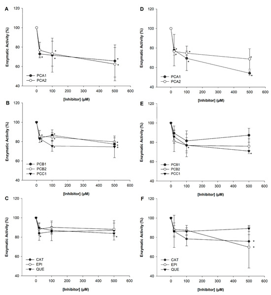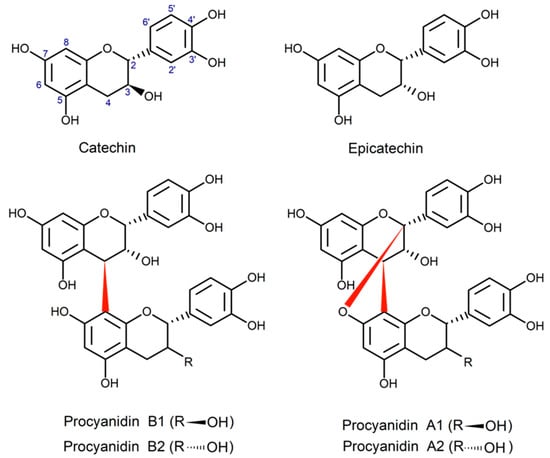 Procyanidins are oligomeric flavonoids with several bioactive properties. Their antidiabetic potential is related to their capacity to inhibit enzymes responsible for the absorption of dietary carbohydrates, such as pancreatic α-amylase. Procyanidins possess great structural diversity, including types of monomers and interflavanic bonds (A- or B-), and the degree of polymerization. However, there is a lack of evidence that systematically analyzes the effect of these structural features on their α-amylase inhibitory activity. In this paper, the activity of a mammalian pancreatic α-amylase was assessed using two different substrates, and the inhibitory activity of five commercially available procyanidins and three monomeric flavonoids was compared. The enzyme-binding sites of the eight compounds were predicted by in silico analysis to help explain the different enzyme-inhibitory activities. The inhibitory activity of procyanidins and monomeric flavonoids depended on the substrate used. A-type dimers presented the best activity against a polymeric substrate, while a B-type dimer was the best inhibitor for an oligomeric substrate. The predicted binding site for dimers and monomers was close to the active site. For the B-type trimer, the binding site was on the back side (approximately 180°) of the catalytic triad. In silico predictions suggested that dimeric procyanidins, especially A-type, could better enter the active site cavity, which could explain their superior inhibitory activity. We may conclude that inhibition of pancreatic α-amylase by procyanidins is mainly related to the type of interflavanic bond and the degree of polymerization. Dimers could be the most effective procyanidins to mildly inhibit this enzyme and present antidiabetic potential.