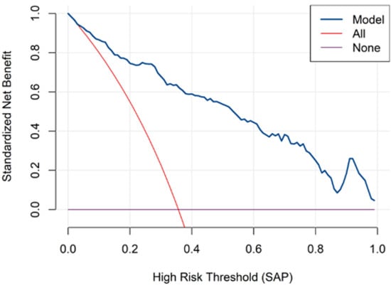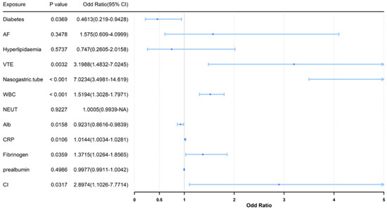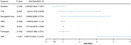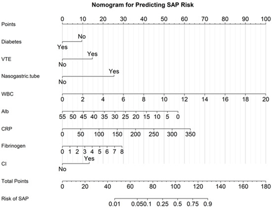 Background: Stroke-associated pneumonia (SAP) is a common complication after acute ischemic stroke and contributes to worse recovery and greater resource use. Nutritional and inflammatory dysregulation have been implicated in both SAP susceptibility and adverse prognosis. Objective: To examine whether admission inflammatory and nutritional markers are associated with the development of SAP and with short-term functional prognosis. Methods: We performed a retrospective single-centre cohort study of consecutive patients with acute ischemic stroke admitted between 1 January 2015 and 31 December 2024 ( ). Admission laboratory indices (albumin, CRP, fibrinogen, WBC, PCT, and prealbumin) in the first 24 h and clinical variables were analysed. Multivariable logistic regression identified factors independently associated with SAP; the relationship between SAP and early functional recovery was assessed in adjusted outcome models. A nomogram integrating key predictors was developed and its apparent discrimination is reported. Results: SAP occurred in 35.6% of patients. Factors independently associated with SAP included nasogastric tube placement (OR: 7.02, 95% CI: 3.50–14.62), venous thromboembolism (OR: 3.20, 95% CI: 1.62–6.31), cognitive impairment (OR: 2.90, 95% CI: 1.32–6.36), and elevated inflammatory markers (WBC OR: 1.52, 95% CI: 1.28–1.80; fibrinogen OR: 1.37, 95% CI: 1.02–1.84; CRP OR: 1.01, 95% CI: 1.00–1.03). Higher admission serum albumin was associated with lower odds of SAP (OR: 0.92, 95% CI: 0.86–0.98). The nomogram showed strong apparent discrimination (AUC: 0.90, 95% CI: 0.86–0.94). After multivariable adjustment, SAP remained associated with poorer short-term functional improvement (adjusted OR: 6.99, 95% CI: 3.05–17.54) and greater healthcare utilization (median length of stay: 39.6 vs. 30.6 days; median cost: USD 12,836 vs. 6585). Conclusion: In this retrospective cohort, admission markers of nutritional depletion and inflammatory activation were associated not only with increased likelihood of SAP, but also with adverse early functional outcomes. These association-based findings support early risk stratification using routine admission markers; prospective studies and external validation are required before clinical implementation.