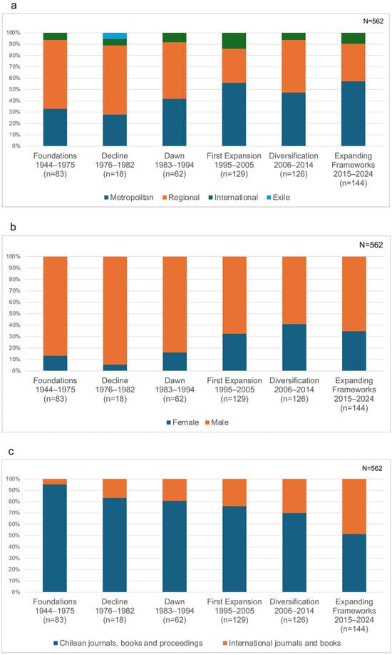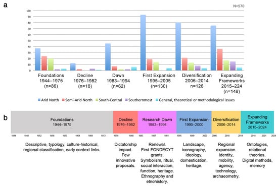 80 years of Chilean rock art research, from its early descriptive stages in the 1940s to the present-day integration of relational ontologies, archaeometric techniques, and interdisciplinary perspectives, is reviewed. 562 publications are analysed, covering four major regions: the Arid North, Semi-Arid North, South-Central, and Southernmost Chile. Drawing from a systematically constructed corpus, we trace the evolution of research questions, theoretical orientations, and methodologies over time, with attention to regional trends and institutional dynamics. Results reveal a gradual shift from typological classification toward more complex approaches addressing mobility, landscape, coloniality, visual agency, and human/non-human relationships. The Arid North emerges as the primary centre of innovation, while southern regions remain in exploratory stages despite recent advances. Comparison with global research trajectories shows how Chile’s situated approaches—marked by decentralisation, theoretical pluralism, and critical reflection—contribute to decolonial and southern perspectives in rock art studies. Rather than reproducing hegemonic models, Chilean scholarship offers alternative epistemologies rooted in context-specific materiality and historical processes. The review highlights the potential of Chilean rock art research to expand the theoretical and methodological horizons of the discipline, positioning it as a fertile field for dialogue with contemporary archaeology and global visual studies.