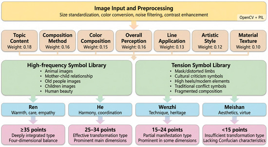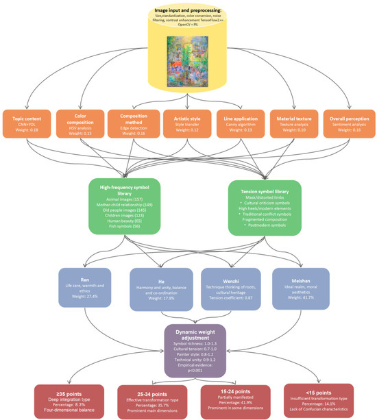 This study advances the Confucian Visual Transformation Model (CVTM) to analyse how Confucian values are visually reformulated in contemporary Malaysian Chinese art. Integrating artist interviews (n = 5), symbolic visual coding, and audience surveys (n = 227), the research addresses the lack of empirical frameworks for transcultural aesthetics. While an initial exploratory factor analysis (EFA) confirmed four dimensions—Ren (benevolence), He (harmony), WenZhi (technique-ideology), and MeiShan (aesthetic-moral)—it also revealed structural overlaps. Consequently, the study proposes CVTM 2.0, which replaces additive metrics with a tension-driven fusion mechanism. Key innovations include a Symbolic Tension Index (STI) for dynamic weighting and a fuzzy integration layer to handle overlap between WenZhi and MeiShan. Results indicate that Confucian dimensions are not static but are activated through compositional and material tensions. Theoretically, this reframes Confucian aesthetics as a context-responsive system; practically, it offers a replicable blueprint for analysing postcolonial identity negotiation in Southeast Asian art.