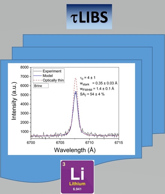 In this work, a quantitative analysis of Li in natural brines was carried out by laser-induced breakdown spectroscopy (LIBS) assisted by the τ–algorithm for detailed analysis of the experimental line shapes (τLIBS). Brine samples were collected from different salars located in the Puna