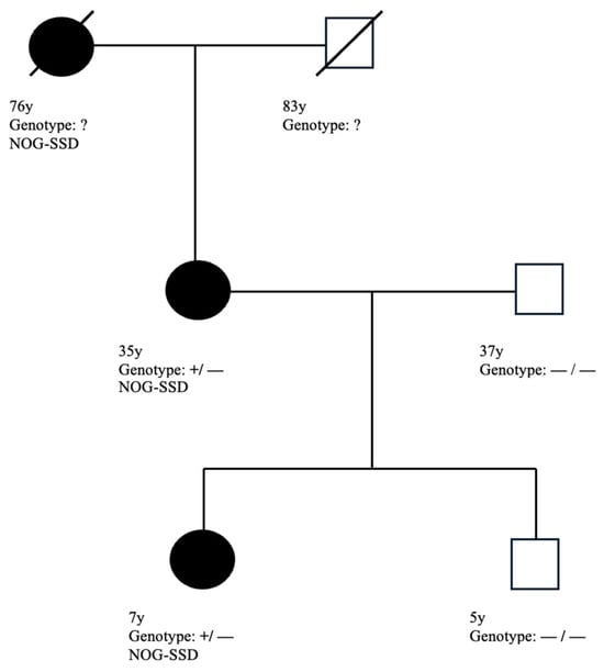 Introduction: Noggin encoding (NOG) gene plays a critical role in early embryogenesis and development of bones, joints, cartilage, eyes, and neural tissue. The NOG gene encodes the noggin protein. Noggin is the only secreted inhibitor of bone morphogenetic protein (BMP) that is associated with abnormal phenotypes in humans. The most commonly observed manifestations of NOG gene mutations include bilateral conductive hearing loss, proximal symphalangism, broad thumbs, hyperopia, and a distinct facial appearance. This genetic disorder was first reported in 1990 by Teunissen and Cremers. Since then, various phenotypic presentations of NOG mutation have been reported, leading to the introduction of the term NOG-related symphalangism spectrum disorder (NOG-SSD). Case report: In this report, we describe a family (mother and daughter) with bilateral mixed hearing loss. Both patients had hyperopia, distinct facial appearance with hemicylindrical nose, broad thumbs, and syndactyly of the second and third toes. Genetic testing confirmed a NOG gene mutation. Bilateral stapedotomy was successfully performed, resulting in significant hearing improvement. However, due to sensorineural component of hearing loss, complete hearing recovery was only achieved with the use of hearing aids. Discussion: The etiology of the sensorineural component of hearing loss in NOG-SSD remains unclear. In animal models, the NOG gene is essential for inner ear development, while in humans, only middle ear malformations have been reported. The phenotypic variability observed in individuals with NOG mutations is very wide, suggesting that the sensorineural component of hearing loss could represent one of the possible manifestations. Conclusions: Conductive hearing loss is the primary manifestation of the NOG-SSD, and all previously reported cases of NOG gene mutations have presented exclusively with conductive hearing loss. It is possible that additional genetic factors, not necessarily directly related to the NOG gene but present in this family, contribute to the development of the sensorineural component of hearing loss, although thorough genetic testing did not reveal any additional mutation. This is, to our knowledge, the first report of mixed hearing loss associated with a NOG mutation confirmed preoperatively. Further studies are needed to determine whether the sensorineural component represents a primary manifestation or arises from secondary mechanisms.