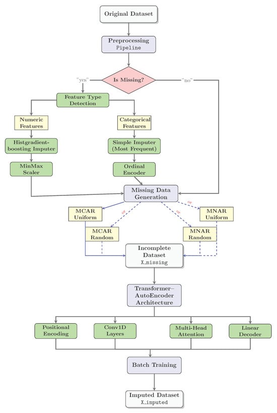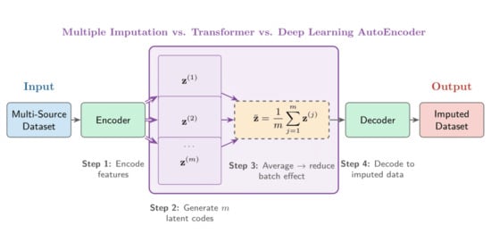 Upstream processes strongly influence downstream analysis in sequential data-processing workflows, particularly in machine learning, where data quality directly affects model performance. Conventional statistical imputations often fail to capture nonlinear dependencies, while deep learning approaches typically lack uncertainty quantification. We introduce a hybrid imputation model that integrates a deep learning autoencoder with Convolutional Neural Network (CNN) layers and a Transformer-based contextual modeling architecture to address systematic variation across heterogeneous data sources. Performing multiple imputations in the autoencoder–transformer latent space and averaging representations provides implicit batch correction that suppresses context-specific remains without explicit batch identifiers. We performed experiments on datasets in which 10% of missing data was artificially introduced by completely random missing data (MCAR) and non-random missing data (MNAR) mechanisms. They demonstrated practical performance, jointly ranking first among the imputation methods evaluated. This imputation technique reduced the root mean square error (RMSE) by 50% compared to denoising autoencoders (DAE) and by 46% compared to iterative imputation (MICE). Performance was comparable for adversarial models (GAIN) and attention-based models (MIDA), and both provided interpretable uncertainty estimates (CV = 0.08–0.15). Validation on datasets from multiple sources confirmed the robustness of the technique: notably, on a forensic dataset from multiple laboratories, our imputation technique achieved a practical improvement over GAIN (0.146 vs. 0.189 RMSE), highlighting its effectiveness in mitigating batch effects.