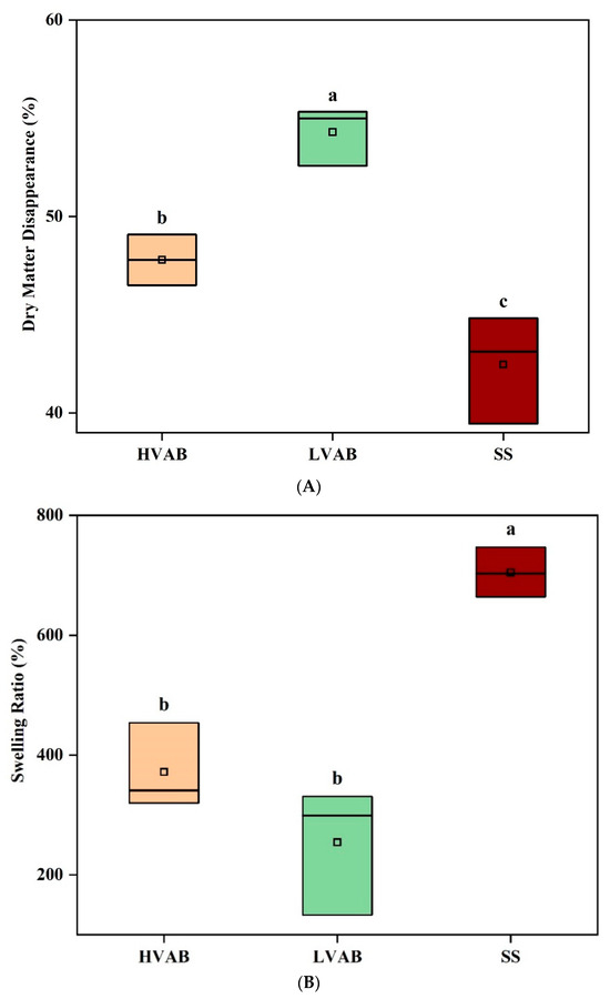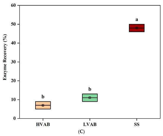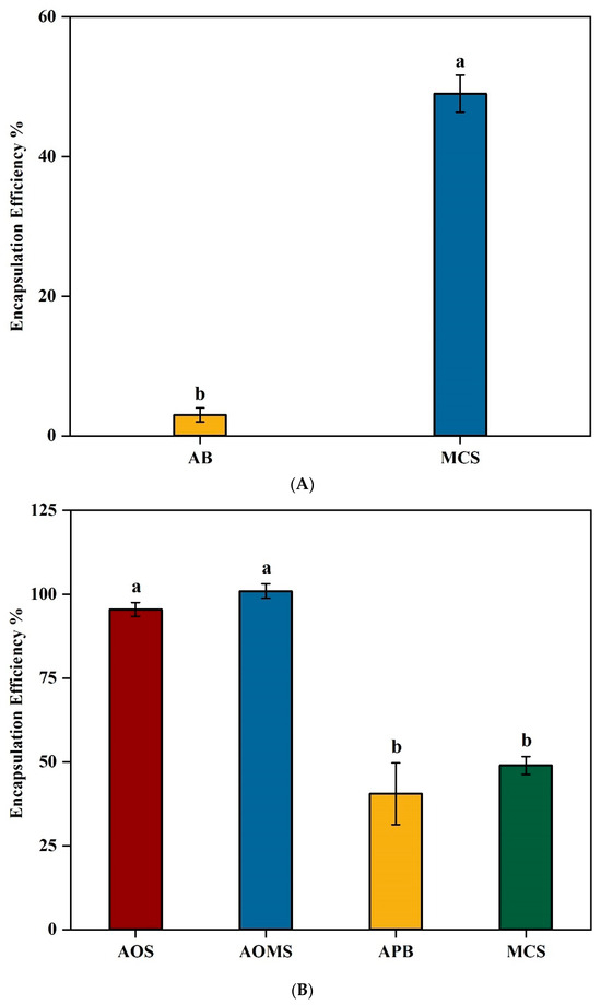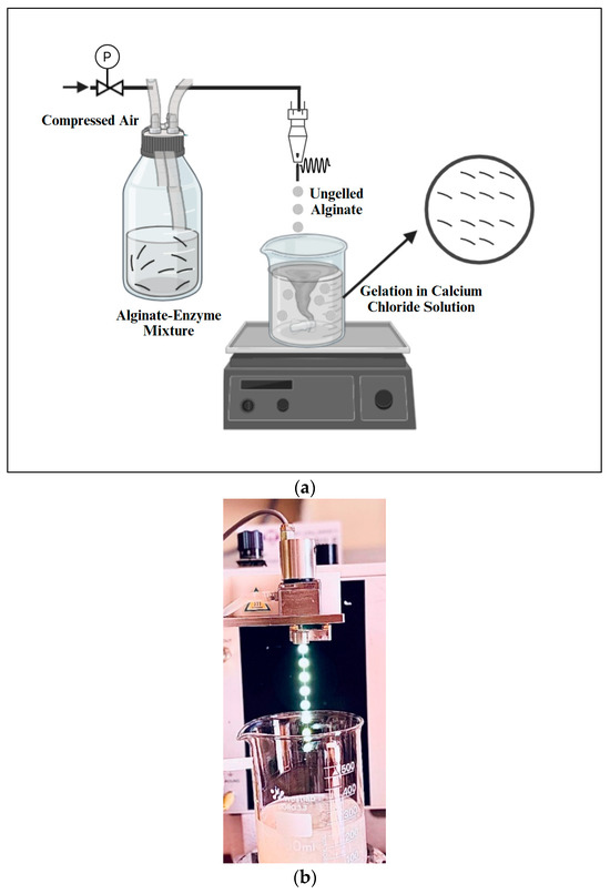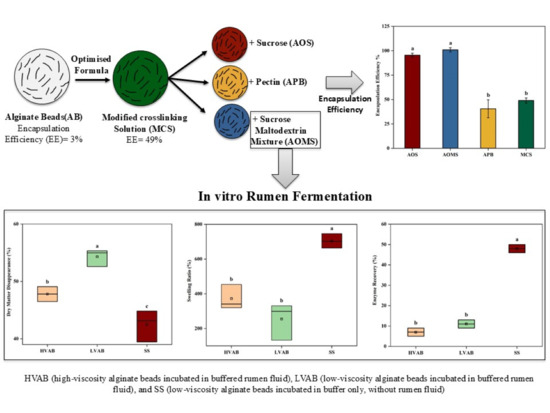 This study aimed to develop a microencapsulation formulation for efficient encapsulation of β-glucosidase to improve its stability in a rumen-like environment and sustain activity post-rumen in the ruminant gut. Various alginate-based formulations were evaluated to achieve high encapsulation efficiency (EE) and stability. These included control alginate beads (AB), microcapsules with chitosan (MCS), alginate–sucrose beads (AOS), alginate–sucrose–maltodextrin beads (AOMS), and alginate pectin beads (APB). The microcapsules were made using Buchi encapsulator B-390 with calcium chloride as the gelling solution. Alginate proved to be a suitable polymer for β-glucosidase encapsulation and <1 mm diameter microbeads were obtained across all formulations. Alginate alone (AB: 1% alginate, 0.2 U/mL β-glucosidase) showed low EE (3% ± 1.0) due to leakage and syneresis. Modifying the gelling solution with 0.1% chitosan (MCS) increased EE to 49 ± 2.64% by reducing alginate porosity. Further improvements were achieved by adding stabilizers to the alginate solution (AB), in addition to using the modified gelling solution (MCS): Adding sucrose (AOS) at 4% increased EE to 95.5 ± 2.08%, while adding sucrose (4%) and maltodextrin (2%) (AOMS) achieved 100 ± 2.16%. On the other hand, adding pectin (4%) (APB) to the alginate solution resulted in a lower EE of 40.5% ± 2.55, likely due to interference with alginate crosslinking. In vitro rumen fermentation showed a dry matter degradation of 42–54%, underscoring the need for more robust microcapsules. Encapsulation strategies, such as incorporation of additional protective layers, are essential to enhance bead stability, minimize degradation, and improve enzyme retention, to ensure efficient delivery and sustained enzymatic activity in the hindgut. Full article