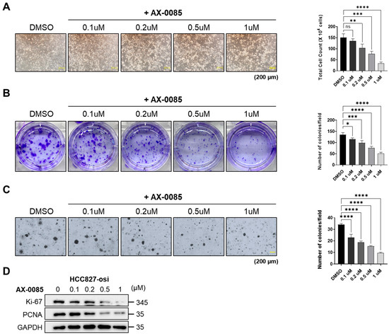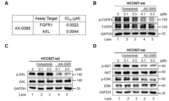 Background: Osimertinib is a third-generation epidermal growth factor receptor (EGFR) tyrosine kinase inhibitor (TKI) with high efficacy in treating patients with advanced non-small cell lung cancer (NSCLC) harboring EGFR-activating mutations. Although osimertinib is a frontline anticancer agent for NSCLC, several patients inevitably develop tumor recurrence caused by osimertinib resistance. The activation of anexelekto (AXL) or fibroblast growth factor receptor 1 (FGFR1) is reported as a major factor driving osimertinib resistance in NSCLC. Thus, targeting AXL and FGFR1 offers the potential to overcome osimertinib resistance. Methods: In this study, we generated osimertinib-resistant cell lines from EGFR-mutant NSCLC cell lines in vitro and investigated the biological significance of AX-0085 on these cell lines by conducting transcriptomic analyses. Results: The expression of several genes associated with MAPK, ERK, and FGF receptor signaling pathways, including AXL, was altered upon AX-0085 treatment of osimertinib-resistant cells. Furthermore, AX-0085 treatment effectively blocked AXL and FGFR1 activation and sensitized osimertinib-resistant cells. Additionally, AX-0085 inhibited AXL and FGFR1-dependent oncogenic events, including cell proliferation, clonogenicity, and migration. Conclusions: The dual inhibition of AXL and FGFR1 by AX-0085 can overcome acquired osimertinib resistance, supporting its potential as a therapeutic strategy for treating patients with osimertinib-resistant tumors.