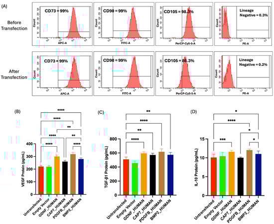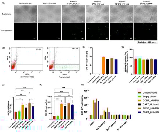 Background/Objectives: Mesenchymal stem cells (MSCs) are recognized for their therapeutic potential due to their ability to secrete bioactive molecules. Among these secreted factors, bone morphogenetic protein-2 (BMP-2) is known as a secreted factor that plays a crucial role in bone healing and regeneration. However, MSCs naturally secrete only small amounts of BMP-2. To improve the bone healing capacity of MSCs, it is essential to enhance the secretion of BMP-2 in MSCs. One approach that can be used to achieve this goal is by genetically engineering MSCs. Incorporating signal peptides (SPs) into the inserted gene sequence can significantly improve protein secretion efficiency. In this proof-of-concept study, we explored the role of SPs in optimizing BMP-2 secretion in umbilical cord-derived MSCs; Methods: Three human-derived SPs, namely glial-derived neurotrophic factor (GDNF), chemotactic antibacterial glycoprotein 7 (CAP7), and platelet-derived growth factor subunit B (PDGFB), were selected. Transfection of MSCs was performed using polyethylenimine, Lipofectamine 2000®, and Lipofectamine 3000®. Transfection efficiency confirmed based on Green Fluorescence Protein expression. BMP-2 secretion levels were quantified using an ELISA assay; Results: Lipofectamine 3000® achieved the highest transfection efficiency, reaching approximately 10%. BMP-2 secretion levels varied significantly depending on the SPs used, with PDGFB yielding the highest BMP-2 concentration (279.21 ± 6.91 pg/mL), followed by GDNF (265.65 ± 11.49 pg/mL) and CAP7 (233.72 ± 32.33 pg/mL); Conclusions: These findings demonstrate that SP selection critically influences BMP-2 secretion efficiency in genetically engineered MSCs and underscore its potential to enhance the therapeutic applicability of MSC-based strategies for bone healing.