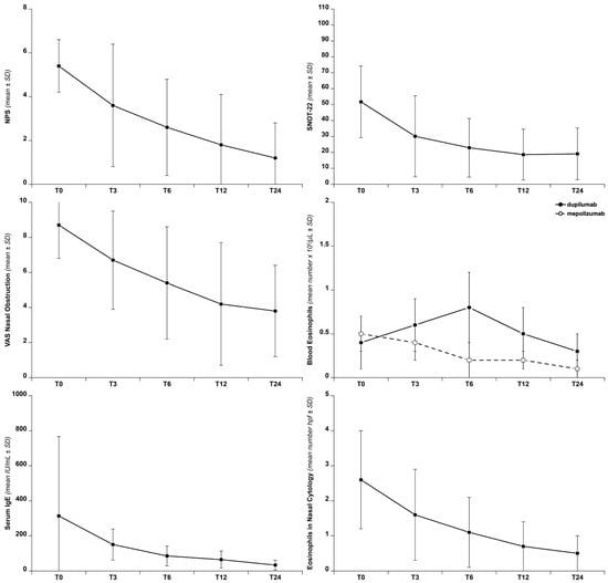 Background/Objectives: In recent years, the recognition that type 2 inflammation plays a leading role in CRSwNP has enabled the more tailored treatment of the disease through improved patient endotyping. We studied 45 patients with severe CRSwNP who were treated with dupilumab or