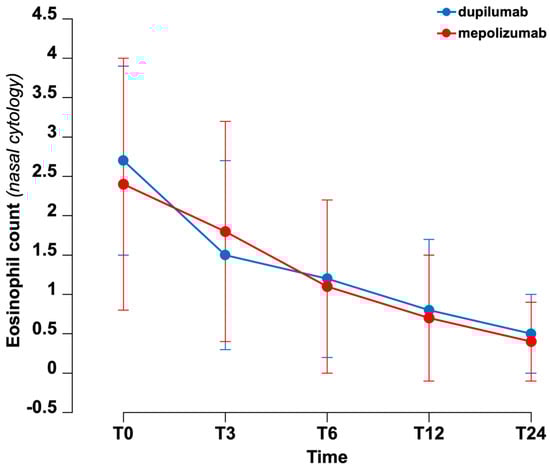 Background/Objectives: In recent years, the recognition that type 2 inflammation plays a leading role in CRSwNP has enabled the more tailored treatment of the disease through improved patient endotyping. We studied 45 patients with severe CRSwNP who were treated with dupilumab or mepolizumab. The aim was to evaluate the efficacy of these treatments on endoscopic, clinical and patient reported parameters, and to assess whether nasal cytology could be useful for identifying responsive patients and monitoring their response to biologic drugs. Methods: Follow-up visits were scheduled at baseline (T0), and at 3 (T3), 6 (T6), 12 (T12), and 24 months (T24). At each visit, patients underwent blood analysis, nasal endoscopy, and nasal scraping for cytology. They also completed the SNOT-22 questionnaire, a visual analog scale (VAS) for nasal obstruction and smell perception, and the Asthma Control Test (ACT) test in cases of concomitant asthma. Results: Biological therapy demonstrated broad efficacy in disease management, based on both clinical and cytological findings. The Nasal Polyp Score, SNOT-22 questionnaire, VAS scores for nasal obstruction and smell, and ACT score showed progressive improvement. Blood eosinophil counts and total IgE levels also decreased over time (T0 vs. T24: p = 0.008 and p < 0.001, respectively). At nasal cytology, a reduction in eosinophil cell count and in the mixed mast cell–eosinophil pattern during treatment with both biologics were observed (T0 vs. T24: p < 0.001). Positive effects were typically recorded within six months of treatment and were sustained after two years. Conclusions: Although the histological evaluation of infiltrated tissues remains the gold standard for assessing mucosal eosinophilia, nasal cytology appears to be a simpler, non-invasive, and repeatable method for evaluating local eosinophilia. Identifying endotypes and assessing the severity of inflammation are crucial for predicting the efficacy of different treatment options.