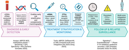 As the most diagnosed form of cancer worldwide, breast cancer (BC) represents a major health issue. Despite the advances in breast oncology research, BC remains a highly lethal disease and ranks as the fifth cause of cancer-related deaths. In recent decades, researchers have intensively exploited next-generation sequencing (NGS) approaches to discover new actionable targets of breast tumor specimens, leading to the development of new therapy regimens (i.e., CDK4/6 inhibitors, PIK3CA inhibitors, etc.). More recently, novel approaches have been developed to improve cancer molecular characterization at epigenetic, transcriptomic, genetic and genomic levels. Moreover, the investigation of analytes retrievable in the peripheral blood (i.e., circulating tumor cells (CTCs), circulating tumor DNA (ctDNA), extracellular vesicles (EVs), etc.) has demonstrated an unprecedented potential to obtain further information concerning the core tumor, and monitor treatment response and minimal residual disease. The topics of interest for this Special Issue can include, but are not limited to, the following: