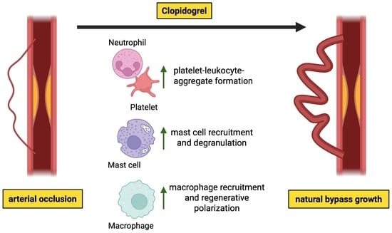 Background/Objectives: Clopidogrel is a P2Y12 receptor inhibitor commonly used as antiplatelet therapy for patients with cardiovascular occlusive diseases. However, its role in vascular remodeling remains poorly understood. Platelets orchestrate the sterile inflammation in arteriogenesis, an endogenous process to bypass an occluded