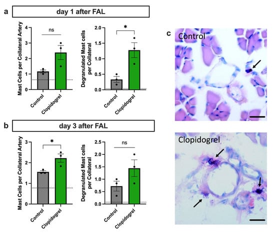 Background/Objectives: Clopidogrel is a P2Y12 receptor inhibitor commonly used as antiplatelet therapy for patients with cardiovascular occlusive diseases. However, its role in vascular remodeling remains poorly understood. Platelets orchestrate the sterile inflammation in arteriogenesis, an endogenous process to bypass an occluded artery. Therefore, we investigated the impact of P2Y12-inhibition by Clopidogrel on arteriogenesis. Methods: In this study, we utilized a well-established murine hindlimb model of arteriogenesis. To quantify the growth of collateral arteries, we employed laser-Doppler perfusion measurements and immunohistological analysis of growing compared to resting collateral arteries. Additional immunofluorescence and histological stains were conducted to assess immune cell recruitment and activation. Whole-blood flow cytometry was performed to analyze platelet–leukocyte interactions, and complete blood counts were obtained to quantify leukocyte and platelet numbers. Results: The findings of this study demonstrate that Clopidogrel promotes perfusion recovery following the induction of arteriogenesis compared to controls, attributed to elevated levels of proliferating vascular cells. Furthermore, compared to controls, Clopidogrel treatment significantly enhanced platelet-leukocyte interactions, increasing perivascular mast cell recruitment and degranulation, finally resulting in regenerative macrophage accumulation required for collateral artery growth. Conclusions: Clopidogrel treatment boosts arteriogenesis by enhancing the local regenerative inflammation relevant for vascular cell proliferation. Therefore, P2Y12 inhibition may represent a therapeutic option to effectively promote natural bypass growth in patients with cardiovascular occlusive diseases.
