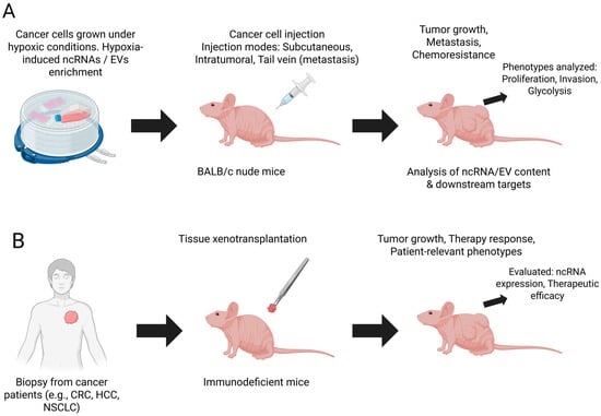 Background: Cancer is a heterogeneous pathology, and among causative factors, gene expression can influence its development. Molecular approaches using extracellular vesicles (EVs) and non-coding RNAs (ncRNAs) offer great value in understanding tumor progression, early diagnosis, and potential therapies. Objectives: This systematic review was conducted in accordance with the Preferred Items for Reporting of Systematic Reviews and Meta-Analyses guidelines. Its main objective was to evaluate the effects of cellular hypoxia in different types of cancer, exclusively using animal models and highlighting the regulatory role of microRNAs and circular RNAs in tumor development. Methods: A literature review was performed using the PubMed/Medline and Scopus databases without year limitations. The initial search yielded 171 articles. After applying the inclusion and exclusion criteria, 25 studies were included in this review. Data analysis showed that animal models provide detailed insights into different types of cancers under hypoxic conditions. Results: Our analysis identified that specific circRNAs, such as circPFKFB4 in breast cancer and circPDK1 in pancreatic cancer, are consistently associated with a worse prognosis and therapeutic resistance. Similarly, miRNAs such as miR-1287-5p (breast cancer) and miR-133a (colorectal cancer) have frequently been identified as tumor suppressors whose levels are altered by hypoxic conditions. Furthermore, the results suggested that in some cancers, the release of EVs may facilitate tumor progression and metastasis. However, manipulation of ncRNA expression causes significant changes in the tumor response, which suggests a therapeutic response. Conclusions: This study shows that the use of animal models is essential for exploring the molecular mechanisms of cancer and establishing new therapeutic approaches.