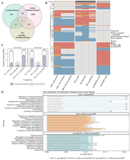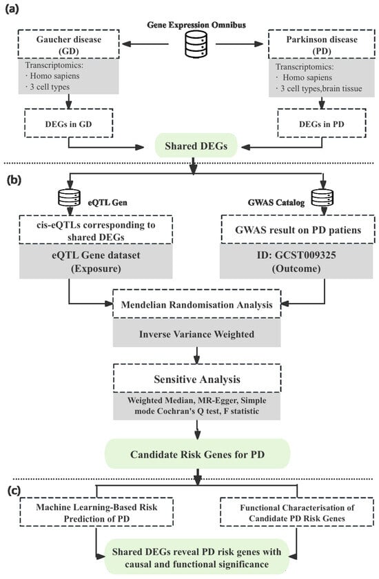 Background/Objectives: Pathogenic variants in the GBA1 gene, which encodes the lysosomal enzyme -glucocerebrosidase, cause Gaucher disease (GD) and represent one of the strongest genetic risk factors for Parkinson’s disease (PD). However, not all carriers develop PD, suggesting the involvement of additional modifiers. Transcriptomic alterations shared between GD and PD may reveal such modifiers and provide insights into the mechanisms linking GBA1 to PD. Methods: Eighteen transcriptomic datasets spanning GD, GBA1-associated PD, and sporadic PD were integrated to identify shared, directionally concordant differentially expressed genes, followed by pathway enrichment analysis. Causal relationships were assessed using two-sample Mendelian randomisation with whole-blood and brain genetic instruments and PD GWAS summary statistics. Diagnostic relevance was evaluated in independent datasets using machine learning, while metabolic implications were explored with a neuron-specific genome-scale metabolic model. Results: Shared DEGs were enriched in lysosomal, lipid, redox, and endocrine pathways. Mendelian randomisation prioritised 12 risk genes in whole blood and 5 in brain tissue, with 4 overlapping; risk-increasing effects were observed for GPNMB, MMP9, TRIM22, TESMIN, NFE2L3, FAM89A, METTL7A, PID1, NECAB2, and LPL, whereas GIPR and RASGRF2 showed protective effects, and AGT was brain-specific. Diagnostic signals were concentrated in a subset of genes, while metabolic modelling revealed convergent but subtype-specific perturbations across metabolic circuits. Conclusions: Convergent genetic, transcriptomic, and metabolic evidence supports at least two mechanistic routes to PD risk: a GBA1-sensitised lysosomal–lipid/redox axis, and a GBA1-independent neuronal–endocrine axis. These findings explain the variable risk among GBA1 carriers, identify candidate biomarkers, and highlight pathway-anchored targets for stratified intervention.
