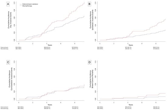 Background/Objectives: Patients with a diagnosis of ductal carcinoma in situ (DCIS) were poorly represented in the four trials that established the efficacy of partial relative to whole-breast irradiation. In contrast to invasive cancers, patients with DCIS are equally likely to have a subsequent ipsilateral invasive event in a different site of the breast from their initial DCIS lesion as they are at the same site. We aim to compare the efficacy of a type of partial-breast irradiation, brachytherapy, to external-beam radiation in the reduction of subsequent invasive cancers. Methods: Women diagnosed with a first breast cancer of unilateral DCIS treated with breast-conserving surgery without endocrine therapy were identified in SEER. Matching was performed 1:2 from patients receiving brachytherapy to patients receiving external-beam radiation or no radiation. External-beam radiation was assumed to be whole-breast radiation for the majority of patients in this cohort diagnosed from 2007 to 2011. Competing risks methods were used to estimate the cumulative incidence of invasive breast events at 10 years and subdistribution hazard ratios (sHRs) in adjusted models with time-varying treatment coefficients were calculated. Results: Among the 1392 matched patients who received brachytherapy or no radiation, the 10-year cumulative incidence of ipsilateral invasive cancer was 5.5% without radiation and 5.7% with brachytherapy (p = 0.92). Brachytherapy was associated with reduced risk of ipsilateral invasive events in the first 3 years (sHR = 0.19, p = 0.03) and non-significantly increased risk after 3 years (sHR = 1.66, p = 0.07). Among the 1392 matched patients who received brachytherapy or external-beam radiation, the 10-year cumulative incidence of ipsilateral invasive cancer was 5.7% with brachytherapy and 3.1% with external-beam radiation. In multivariate regression, brachytherapy was associated with unchanged risk in the first 3 years but increased risk after 3 years (sHR = 2.20, p = 0.009). Conclusions: Our results suggest that brachytherapy may be associated with a higher invasive recurrence risk for patients with DCIS treated without endocrine therapy, as it did not prevent more invasive ipsilateral events than no radiation, and provided reduced risk reduction in the ipsilateral breast relative to external-beam radiation. Further work is needed to identify if this is specific to brachytherapy or applies to all forms of partial-breast irradiation.