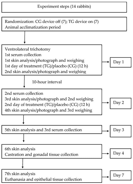 Background/Objective: The effectiveness of blue-light phototherapy (PT) is mainly dependent on the total dose of light (time under PT and amount of skin exposed) received by infants. The primary aim of this study was the development of a novel, flexible, and stretchable device to provide continuous PT treatment, avoiding temporary interruptions that are often observed in practice, such as during breastfeeding, for example. This study evaluated the biocompatibility of a novel, low-cost blanket equipped with light-emitting diode (LED) lamps designed to maintain therapeutic efficacy while facilitating uninterrupted skin-to-skin contact. Methods: Fourteen New Zealand White rabbits, weighing approximately 2.9 kg and aged 4 months, were randomly assigned to an experimental group (TG, n = 7) or a control group (CG, n = 7). The TG received phototherapy directly on the skin (irradiance: 19.3 [13.0–22.0] µW/cm−2/nm−1) during two 12 h sessions over consecutive days, while the CG remained under identical conditions with the device turned off. Biochemical, hematological, dermatological, and histological parameters, as well as rectal and skin temperatures, were assessed. Results: The results showed no differences in clinical appearance or histological analysis of skin tissue between the groups. Blood analysis indicated a reduction in absolute monocyte counts in the TG compared to the CG (p = 0.049), though levels remained within normal ranges. Skin temperature was consistently higher in the TG, except during the initial measurement. Rectal temperatures were similar on the first day but lower in the TG on the second day (mean 40.3 ± 0.21 °C vs. 40.7 ± 0.32 °C; p = 0.039). Conclusions: Temperature levels remained within physiological limits for both groups throughout the study. The device demonstrated biocompatibility and caused no adverse dermatological, hematological, or biochemical effects.
