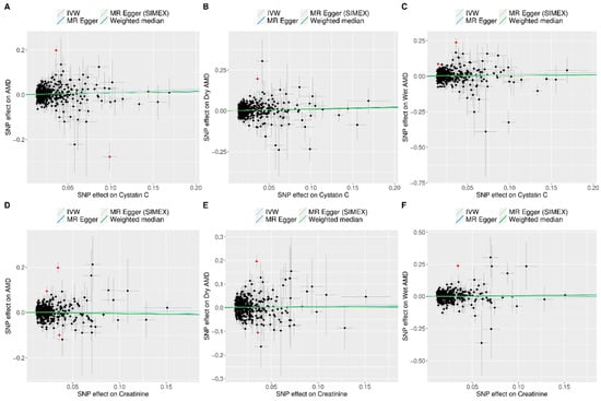 Background/Objectives: Previous studies have shown an association between kidney function and age-related macular degeneration (AMD). This study aims to assess whether the kidney function-related parameters of serum cystatin C and creatinine levels are associated with increased risk of AMD and its subtypes. Methods: Genetic instruments for variants associated with serum cystatin C and creatinine levels as exposure at genome-wide significance (p < 5.0 × 10−8) were obtained from the UK Biobank. Genetic data for AMD and its subtypes were obtained from the FinnGen project. A two-sample Mendelian randomization analysis was performed to evaluate the causal effects of serum cystatin C and creatinine levels on AMD and its subtypes. Results: Using an inverse-variance weighted approach, higher cystatin C levels are associated with an increased risk of AMD [odds ratio (OR) = 1.13, 95% confidence interval (CI): 1.04 to 1.22, p = 0.004 for overall AMD; OR = 1.14, 95% CI: 1.04 to 1.25, p = 0.007 for dry AMD; OR = 1.14, 95% CI: 1.03 to 1.26, p = 0.011 for wet AMD]. However, serum creatinine levels did not significantly impact the risk of AMD or its subtypes. Conclusions: This study provides genetic evidence that higher cystatin C levels may be a causal risk factor for AMD and its subtypes, whereas serum creatinine was not. This result implies the need to investigate the effect of cystatin C on AMD potentially independent of kidney function.