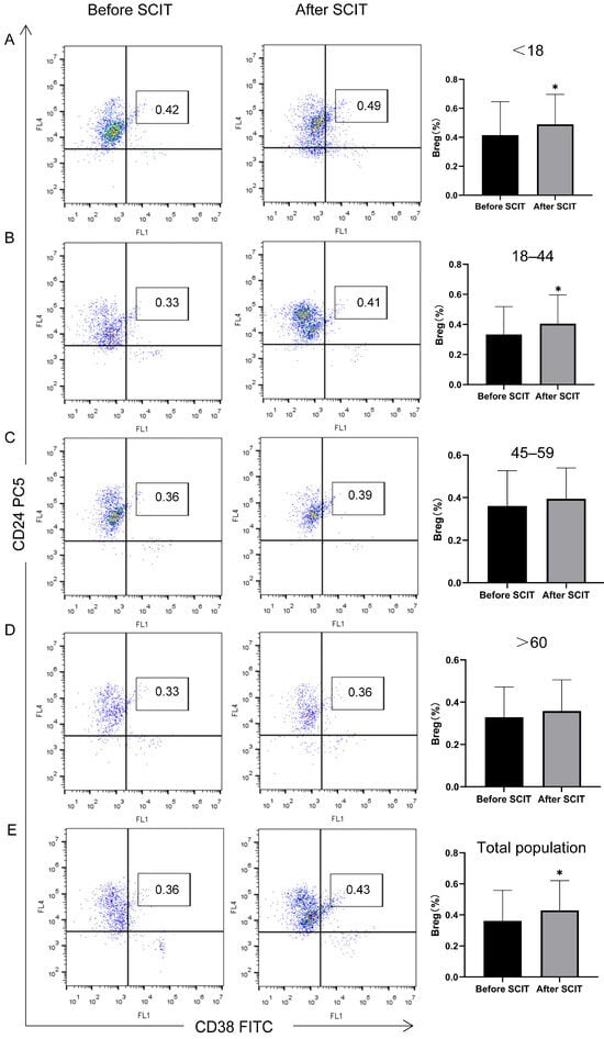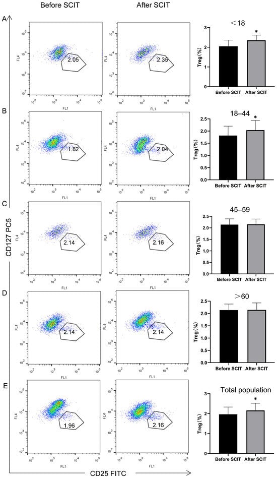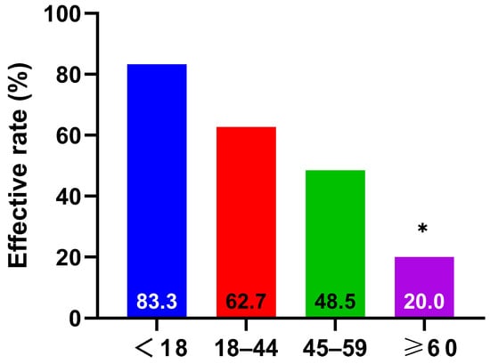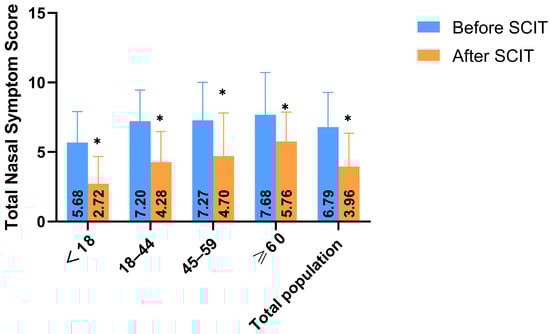 Background/Objectives: To investigate the relationship between patient age and the clinical efficacy of subcutaneous immunotherapy (SCIT) for allergic rhinitis (AR), aiming to provide a reference for patient selection and efficacy improvement in clinical practice. Methods: We conducted a retrospective statistical analysis of clinical