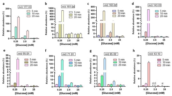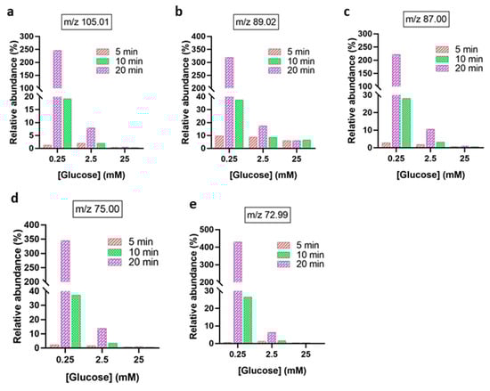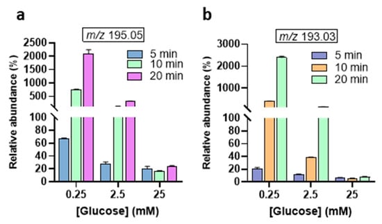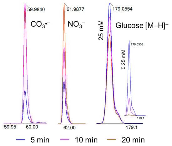 Background: Glucose, a central carbohydrate in higher organisms’ metabolism, can undergo extensive oxidative modification under conditions of excessive inflammation or elevated reactive oxygen and nitrogen species (RONS). Such modifications yield glucose oxidation products (GOPs) with potential biological relevance and toxicity. This study aimed to systematically characterize GOP formation under defined oxidative conditions generated by gas plasma treatment. Methods: D-glucose solutions were prepared at 0.25 mM (hypoglycemic/diabetic range), 2.5 mM (sub-physiological), and 25 mM (peritoneal dialysis fluid). Samples were exposed for up to 20 min to the atmospheric-pressure argon plasma jet kINPen, which produces a wide spectrum of RONS. Treatment time-dependent glucose oxidation was assessed by high-resolution mass spectrometry (HRMS) and tandem mass spectrometry (MS/MS) to identify the oxidation products. Results: Gas plasma exposure generated various oxidation products and their abundance profiles depended on initial glucose concentration and treatment duration. Identified products included 2-keto-D-glucose, 3-deoxyglucosone (3DG), 3,4-dideoxyglucosone-3-ene (3,4DGE), furaldehyde, methylglyoxal, and acetaldehyde. HRMS/MS analysis confirmed diagnostic fragment ions for each GOP and revealed distinct formation across the model scenarios. Conclusions: Cold gas plasma induces a spectrum of glucose oxidation products under biomedically relevant glucose levels. The identified GOPs, many of which have known cytotoxic or signaling properties, provide mechanistic insight into glucose oxidation in inflamed or oxidative microenvironments. These findings support the utility of plasma-based oxidative models for studying GOP-associated biological effects and potential pathophysiological consequences.
