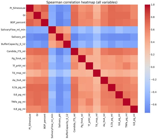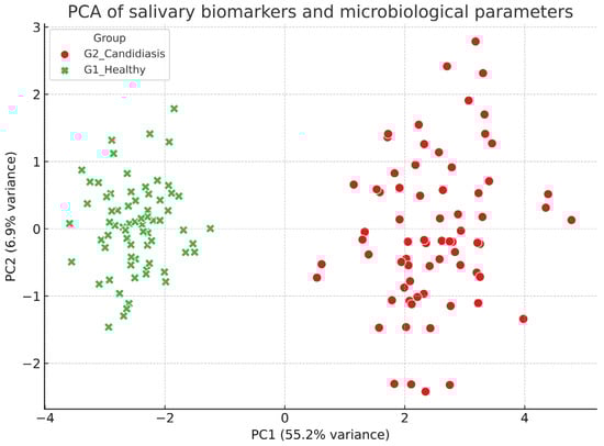 Background/Objectives: Pediatric periodontal inflammation arises from complex host–microbe interactions. Beyond bacterial biofilms, fungal colonization—particularly by Candida albicans—is increasingly recognized as a contributor. The aim of this study was to investigate the relationship between fungal and bacterial colonization, host inflammatory mediators, and salivary parameters in children. It also aimed to identify salivary biomarkers that could be useful for the early diagnosis of oral candidiasis and periodontal inflammation. Methods: A cross-sectional study was performed on 140 children (8–15 years): healthy controls (n = 70) and cases with oral candidiasis (n = 70). Clinical indices (Plaque Index, Gingival Index, Bleeding on Probing), salivary flow, pH, and buffering capacity were recorded. Quantitative PCR assessed C. albicans and four periodontal pathogens, while ELISA measured salivary cytokines (IL-1β, IL-6, TNF-α, IL-8). Analyses included group comparisons, correlations, regression modeling, and principal component analysis (PCA). Results: Children with candidiasis exhibited higher PI, GI, and BOP (p < 0.001), along with reduced pH and buffering capacity (p < 0.001). Salivary loads of C. albicans and all targeted pathogens were elevated (p < 0.001). Cytokine levels were markedly increased (p < 0.001). GI correlated with C. albicans (ρ = 0.71) and cytokines (ρ = 0.62–0.76). Logistic regression identified C. albicans and IL-1β as independent predictors, while salivary pH and flow were found to be protective. PCA distinguished groups, with PC1 (55.2%) driven by fungal and cytokine markers. Conclusions: Oral candidiasis in children is defined by distinct microbial and inflammatory profiles. Salivary biomarker integration offers potential for early, non-invasive diagnosis and risk stratification.