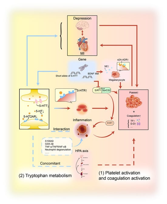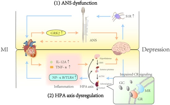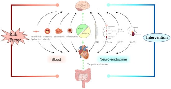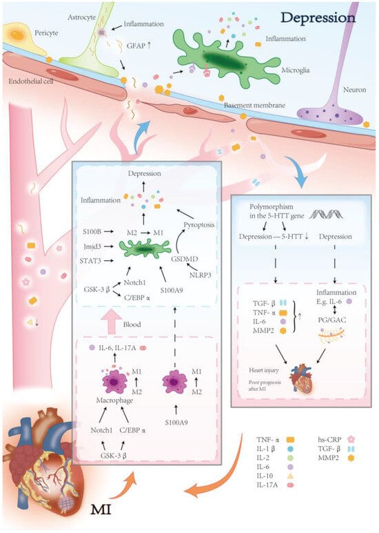 Myocardial infarction (MI) and depression exhibit a bidirectional relationship, in which patients with MI are more susceptible to depression, and individuals with depression face a heightened risk of MI. The two diseases are intricately intertwined via the heart–brain axis. Sex, age, lifestyle, social