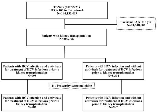 Background/Objectives: Chronic hepatitis C virus (HCV) infection remains a significant comorbidity in patients with end-stage renal disease (ESRD), complicating outcomes after kidney transplantation. The anti-viral treatment of HCV infection including Direct-acting antivirals (DAAs) have transformed HCV treatment, but evidence remains limited. Methods: We conducted a retrospective, real-world cohort study using the TriNetX Analytics Network. Patients were divided into two cohorts: those who received anti-viral treatment of HCV infections before transplant (n = 982) and those who did not (n = 982), following 1:1 propensity score matching. Results: Outcomes assessed one year post-index included mortality, hepatic complications, graft failure, and serum creatinine >6 mg/dL. Anti-HCV infection treated patients had significantly lower risks of graft failure (aHR: 0.656; 95% CI: 0.434, 0.993; p < 0.001) and severe renal dysfunction (aHR: 0.619; 95% CI: 0. 0.390, 0.984; p < 0.001) compared to untreated patients. While mortality (aHR: 0.901; 95% CI: 0.728, 1.114) and liver-related outcomes trended favorably in the treated group, they did not reach statistical significance. Conclusions: Our findings demonstrate that pre-transplant anti-viral treatment of HCV infection in HCV-infected kidney transplant recipients is associated with improved graft survival and renal function.
