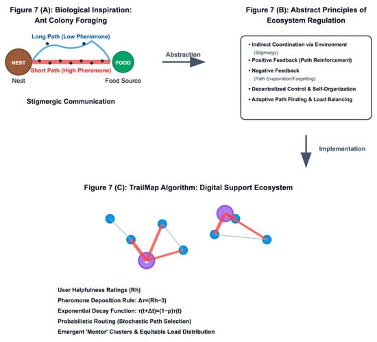 Online peer support platforms are vital, scalable resources for mental health, yet their effectiveness is frequently undermined by inefficient user matching, severe participation inequality, and subsequent “super-helper” burnout. This study introduces TrailMap, a novel peer-matching algorithm inspired by the decentralised foraging strategies of