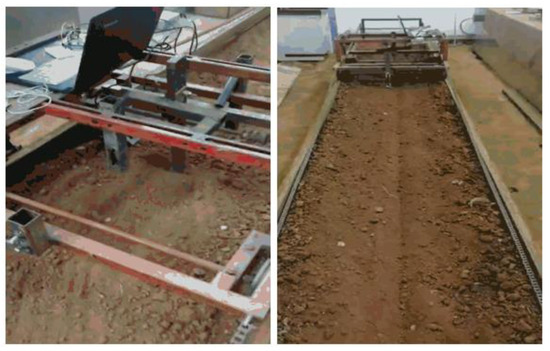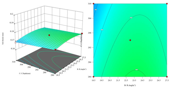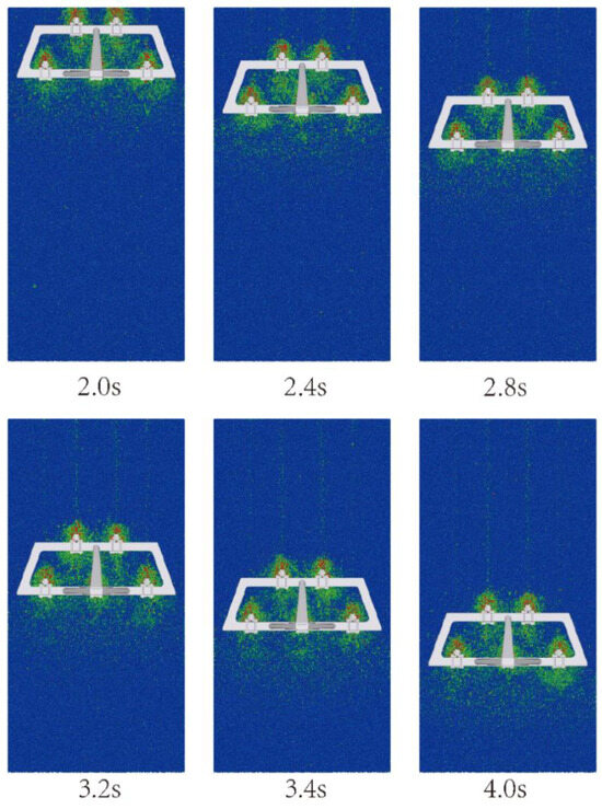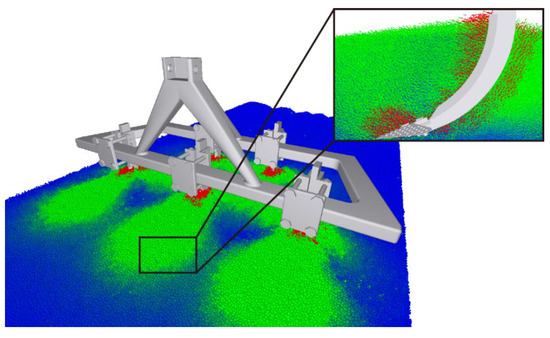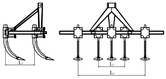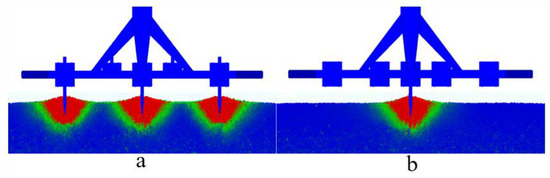 In the process of operating subsoiling implements on sloping red soil in Southwest China, the subsoiler tip faces significant challenges due to strong soil adhesion and severe compaction. By employing engineering bionics, integrating bionic geometric structures and surfaces, this study focuses on the subsoiler tip and designs four types of bionic geometric surface structures: bionic convex hull, bionic micro-spike convex hull, bionic scales, and bionic micro-spike scales. Finite element force analysis and discrete element simulation experiments reveal that bionic surfaces and geometric structures exhibit significant advantages in terms of total deformation, equivalent elastic strain, and stress. These structures are less prone to deformation and fracture under loads, demonstrating a stronger bearing capacity. A discrete element simulation analysis indicates interference phenomena among the subsoilers during multi-subsoiler operations. Based on bionic multi-subsoiler implements, optimized designs were developed through discrete element simulations and soil bin tests. The optimized bionic multi-subsoiler implement features a micro-spike convex hull surface, with micro-spike scale surfaces arranged equidistantly along the edge corners of the shovel face: six on each side wing and three in the middle. The optimal operating parameters were a subsoiling speed of 1.25 m/s, an entry angle of 23.917°, and an entry depth of 280.167 mm. The relative errors between the simulated and experimental values for the soil looseness and soil disturbance coefficients were 19.7% and 18.1%, respectively. The soil bin test results showed soil looseness and soil disturbance coefficients of 19.5% and 17.6%, respectively. At this point, the resistance reduction and wear resistance performance were optimal. This study proposes a bionic design approach for reducing resistance and enhancing wear resistance during the subsoiling process in the viscous red soil of Southwest China, providing a reference for the design and development of new equipment for working in this soil environment. This study is the first to implement a composite biomimetic surface—combining crayfish-like micro-spike convex hulls and sandfish-like micro-scale scales—on multi-shank subsoiler tips, and to validate it using FEA, DEM, and soil tank testing. Under an optimized configuration and operating conditions, the mean particle disturbance velocity increased from 1.52 m/s to 2.399 m/s (+57.8%), and the simulation/experiment relative errors for the soil loosening and disturbance coefficients were approximately 1.03% and 2.84%, respectively. These results demonstrate an engineering-acceptable trade-off between disturbance efficiency and wear resistance and indicate a clear potential for industrial application.