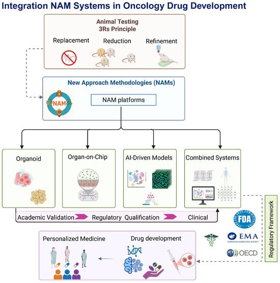 Traditional animal-based preclinical models, including xenografts and genetically engineered mice, have been used for assessing pharmacodynamics, toxicity, efficacy, and safety for decades. Despite their limited ability to mimic human tumor heterogeneity, immune interactions, and microenvironmental complexity, over 90% of oncology candidates that succeed in animal studies fail in clinical trials. The New Approach Methodologies (NAMs), which include patient-derived organoids, organ-on-chip platforms, and AI-driven computational models, provide human-relevant solutions that can improve predictive validity, mechanistic insight, and ethics. Through these technologies, it will be possible to replicate tumor biology specific to patients, to support co-clinical trial designs, and to facilitate biomarker discovery while reducing animal testing. Several recent regulatory reforms, including the Food and Drug Administration (FDA) Modernization Act 2.0 and the European Medicines Agency’s NAM qualification framework, have established clear pathways for the integration of validated NAMs into preclinical drug evaluation. Critically evaluating the scientific rationale, comparative performance, and regulatory context of key NAM platforms in oncology, this review highlights opportunities for synergistic integration, technical refinement, and global harmonization in order to accelerate the development of clinically effective cancer therapeutics based on preclinical findings.