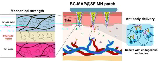 Microneedle (MN) patches comprise a promising platform for transdermal delivery of macromolecular therapeutics. However, achieving sufficient mechanical strength for skin penetration while maintaining high biocompatibility and efficient antibody loading remains a major challenge. In this study, we designed and developed a core–shell-structured hydrogel