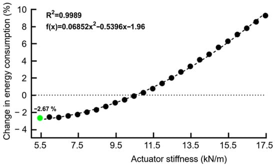Objective: A modeling and simulation tool, OpenSim, was used to determine the optimal relationship between actuator stiffness and actuation timing of a passive ankle exoskeleton for reducing metabolic costs during walking. We hypothesized that the absolute minimum in total metabolic cost would exist at an actuation timing of 15% of stance and at a spring stiffness of 7.5 kN/m. We also hypothesized that a local minimum in total metabolic cost would exist at an actuation timing of 50% of stance. Methods: Bilateral kinematics and kinetics data were collected on a healthy male walking overground wearing his regular tennis shoe. The passive ankle exoskeleton geometry and the spring actuator were integrated into the OpenSim model. Simulations were performed for every combination of 25 spring stiffnesses ranging from 5.5 kN/m to 17.5 kN/m (increments of 0.5 kN/m) and 10 actuation timings ranging from 15% to 60% of stance (increments of 5%). Total energy expenditure was calculated as the sum of the energy expenditure of all the muscles in the model. Results: The greatest reduction in energy consumption (−2.67%) was observed at an actuation timing of approximately 15% of the stance phase with a spring stiffness of ~5.5 kN/m. A quadratic relationship between spring stiffness and energy consumption was identified (R2 = 0.99), with an optimal stiffness of approximately 5.5 kN/m minimizing the energy cost. Conclusions: Our findings suggest that OpenSim effectively predicts optimal exoskeleton parameters, supporting personalized assistance to improve energy efficiency and rehabilitation outcomes.