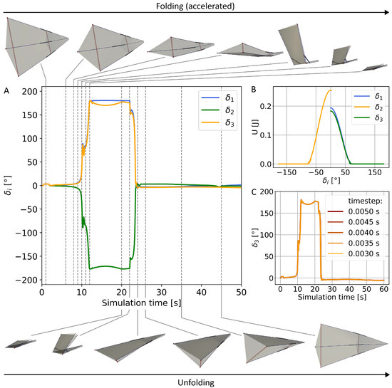 In this work, a numerical tool is presented to simulate the dynamics of insect wing folding by example of the fan folding of the dermapteran hindwing. The scalability of the system is demonstrated by generalising the mechanical behaviour from the small geometry of the wing to a suitable scale for engineering applications, such as deployable structures for space applications. The tool is written in Python and based on the MuJoCo physics engine. Sections of the anal fan are modelled as a bar-and-hinge model with elastic tendons, allowing a high number of design parameters and fast computation. In light of these advantages, the wing folding and unfolding behaviour is investigated with respect to the tendon’s elastic properties and the actuation of the deformation. Bistability is characterised using a single tendon and the entire fan section. Given the upscaled geometry of the analysed section, the required tendon characteristics to transition between the stable states are identified within a reasonable range for technological transfer towards biomimetic structures modelled after the dermapteran hindwing.