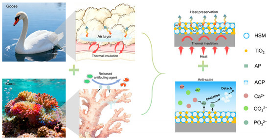 Scaling and thermal loss on the surfaces of industrial equipment and pipelines usually lead to increased energy consumption and reduced operational efficiency. To solve these severe problems, developing advanced coatings with the dual functions of scale resistance and thermal insulation is an effective approach. Inspired by the antifouling agents released from corals and the thermal insulation of goose down, we herein have developed a bioinspired hollow silica microsphere-based (BHSM) coating, exhibiting the synergistic effect of anti-scaling and thermal insulation properties. The BHSM coating is composed of aluminum phosphate (AP) as an inorganic adhesive and scale inhibitor, and hollow silica microspheres (HSMs) as a thermal insulator. In brief, the effective anti-scaling capability comes from released phosphate ions of AP adhesive for chelating with mineral ions, while the high thermal insulation results from the internal air of the HSMs. Compared to the stainless steel (SS 304), the BHSM coating exhibited ~86% scale reduction. Furthermore, the extremely low thermal conductivity of the HSMs endows the BHSM coating with excellent thermal insulation, resulting in a 20% reduction in heat loss relative to the SS 304 surface. Thus, this work presents a promising strategy for anti-scaling and thermal insulation in industrial equipment and pipelines.