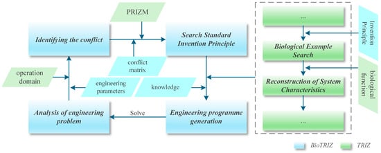 While BioTRIZ is widely employed in biomimetic design to facilitate creative ideation and standardize workflows, accurately formulating domain conflicts and assessing design schemes during critical stages—such as initial concept development and scheme evaluation—remains a significant challenge. To address these issues, this study proposes an advanced BioTRIZ method. Firstly, the theory of technological evolution is integrated into the domain conflict identification stage, resulting in the development of a prompt framework based on patent analysis to guide large language models (LLMs) in verifying the laws of technological evolution (LTE). Building on these insights, domain conflicts encountered throughout the design process are formulated, and inventive principles with heuristic value, alongside standardized biological knowledge, are derived to generate conceptual solutions. Subsequently, a main parameter of value (MPV) model is constructed through mining user review data, and the evaluation of conceptual designs is systematically performed via the integration of orthogonal design and the fuzzy analytic hierarchy process to identify the optimal combination of component solutions. The optimization case study of a floor scrubber, along with the corresponding experimental results, demonstrates the efficacy and advancement of the proposed method. This study aims to reduce the operational difficulty associated with implementing BioTRIZ in product development processes, while simultaneously enhancing its accuracy.