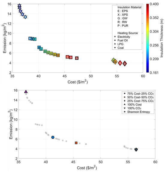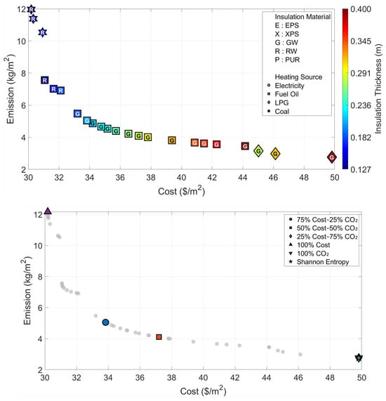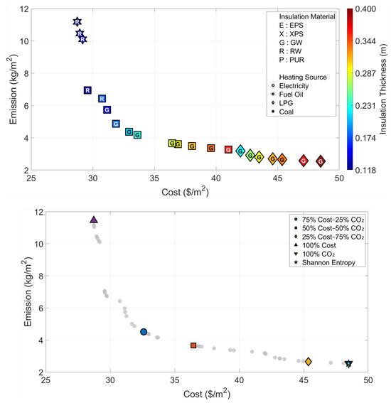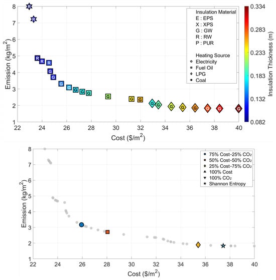 The urgent need for sustainable building design calls for advanced optimization methods that simultaneously address economic and environmental objectives, particularly those involving mixed discrete-continuous variables such as insulation material, heating source, and insulation thickness. While nature-inspired metaheuristics have shown promise in engineering optimization, their application to building envelope design remains limited, especially in handling discrete choices efficiently within a multi-objective framework. Inspired by the natural process of rainwater runoff and drainage basin dynamics, this study presents a novel hybrid approach integrating the Multi-Purpose Flow Direction Algorithm (MOFDA) with One-Hot Encoding to optimize external wall insulation. This bio-inspired algorithm mimics how water seeks optimal paths across terrain, enabling effective navigation of complex design spaces with both categorical and continuous variables. The model aims to minimize total lifecycle costs and CO2 emissions across Türkiye’s six updated climatic regions. Pareto-optimal solutions are created using MOFDA, after which the Complex Proportional Assessment (COPRAS) method, weighted by Shannon Entropy, selects the most balanced designs. The results reveal significant climate-dependent variations: in the warmest region, the cost-optimal thickness is 3.3 cm (Rock Wool), while the emission-optimal reaches 17.3 cm (Glass Wool). In colder regions, emission-driven scenarios consistently require up to 40 cm insulation, indicating a practical limit of current materials. Under balanced weighting, fuel preferences shift from LPG in milder climates to Fuel Oil in harsher climates. Notably, Shannon Entropy assigned a weight of 88–92% to emissions due to their wider variability across the Pareto front, underscoring the environmental priority in data-driven decisions. This study demonstrates that the bio-inspired MOFDA framework, enhanced with One-Hot Encoding, effectively handles mixed discrete-continuous optimization and provides a robust, climate-aware decision tool for sustainable building design, reinforcing the value of translating natural flow processes into engineering solutions.