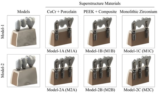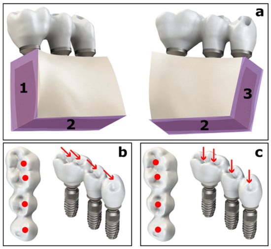This finite element study compared the effects of prosthetic superstructure material and supporting implant number on stresses in implants, multiunit abutments, and restorations, and on peri-implant bone strains under bruxism-like loading. Two posterior mandibular models representing missing left FDI 34–36 were generated: a