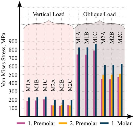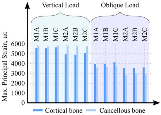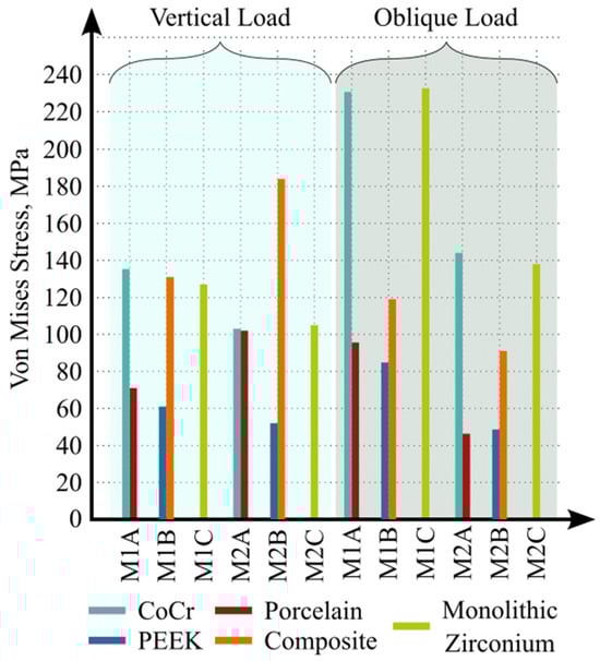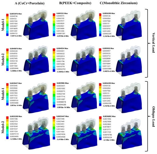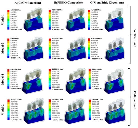 This finite element study compared the effects of prosthetic superstructure material and supporting implant number on stresses in implants, multiunit abutments, and restorations, and on peri-implant bone strains under bruxism-like loading. Two posterior mandibular models representing missing left FDI 34–36 were generated: a 2-implant configuration (implants at 34 and 36) and a 3-implant configuration (implants at 34, 35, and 36), each restored with a three-unit implant-supported fixed bridge. For each configuration, three superstructure materials were simulated: cobalt–chromium (Co–Cr), polyetheretherketone (PEEK), and monolithic zirconia (MZ). Static parafunctional loads were applied as a 500 N oblique load (30° to the implant long axis; 125 N to each buccal cusp) and a 1000 N vertical load applied to the central fossae. Cortical bone generally exhibited higher strain than trabecular bone, and the maximum cortical principal strain under vertical loading averaged approximately 5800 μɛ. The highest implant von Mises stress occurred in the first molar implant of the 2-implant MZ model under oblique loading, while the maximum under vertical loading was 236 MPa (also 2-implant MZ). Prosthetic peak stresses reached 184 MPa under vertical loading (3-implant PEEK composite–veneered model) and 233 MPa under oblique loading (2-implant MZ), with a minimum of 51 MPa in the 3-implant PEEK framework under vertical loading. Overall, increasing implant number reduced the stress/strain values, and MZ showed comparatively higher stress and strain levels.