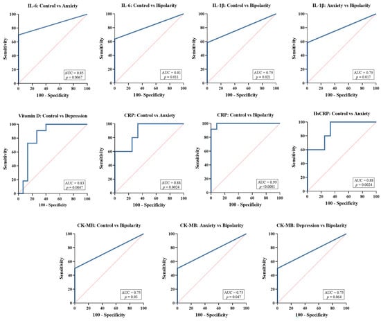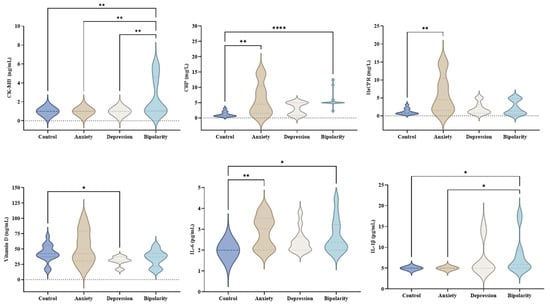 Mental disorders, including anxiety, depression, and bipolar disorder, are frequently associated with metabolic, inflammatory, and behavioral alterations that modulate their clinical expression and increase the risk of physical comorbidities. This cross-sectional study aimed to characterize the profile of inflammatory, metabolic, and cardiac biomarkers in individuals with mental disorders compared to healthy controls, also considering anthropometric and lifestyle indicators. Fifty volunteers were evaluated and distributed into four groups: control, anxiety, depression, and bipolar disorder. All participants completed the Depression, Anxiety, and Stress Scale—21 items (DASS-21) and underwent blood collection for the assessment of inflammatory biomarkers such as C-Reactive Protein and its high-sensitivity detection (CRP/hs-CRP), Interleukins (IL-6, IL-1β) and Tumor Necrosis Factor alpha (TNF-α), metabolic biomarkers (vitamin D, cortisol, and D-dimer), and cardiac biomarkers such as N-terminal pro-B-type Natriuretic Peptide (NT-proBNP), Creatine Kinase—MB (CK-MB), troponin I (cTnI), and myoglobin (Myo). The results showed a significantly higher body mass index (BMI) in clinical groups, particularly in groups with anxiety and depression. Biomarker analyses revealed significant differences in groups with mental disorders. Elevated levels of CRP (p = 0.0038), hs-CRP (p = 0.0048), and IL-6 (p = 0.0030) were identified in the anxiety group, while the depression group was characterized by reduced vitamin D levels (p = 0.0302). Individuals with bipolar disorder presented significantly higher levels of CK-MB (p = 0.0016), CRP (p < 0.0001), IL-6 (p = 0.0198), and IL-1β (p = 0.0067). It was also observed that most individuals with mental disorders did not engage in physical activity. This inactivity was associated with worse emotional scores, higher systemic inflammation, and vitamin D deficiency. These findings reinforce the existence of an integrated axis between metabolism, inflammation, and behavior, in which excess weight, sedentary lifestyle, and nutritional deficiencies synergistically contribute to the maintenance of psychiatric symptoms and metabolic vulnerability. Integrating biomarkers, BMI, and behavioral factors may aid in identifying clinical subphenotypes and guiding more precise and individualized therapeutic strategies.