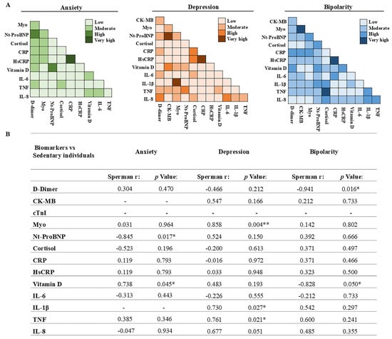 Mental disorders, including anxiety, depression, and bipolar disorder, are frequently associated with metabolic, inflammatory, and behavioral alterations that modulate their clinical expression and increase the risk of physical comorbidities. This cross-sectional study aimed to characterize the profile of inflammatory, metabolic, and cardiac biomarkers