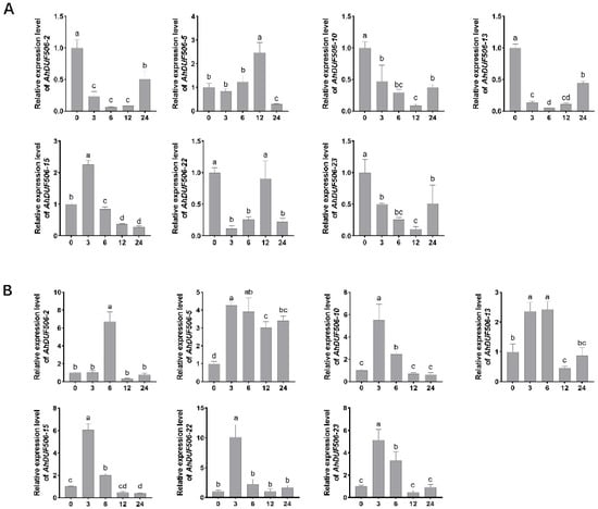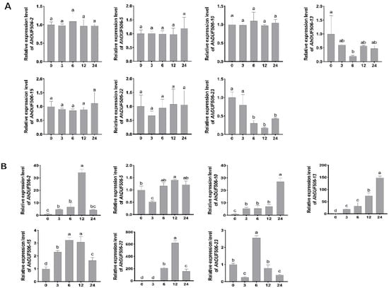 The Domain of Unknown Function 506 (DUF506) family, part of the PD-(D/E)XK nuclease superfamily, has been shown to play a vital role in plant development and responses to abiotic stresses. However, the function of the DUF506 family in cultivated peanuts remains unknown. This study identified 23 AhDUF506 genes using bioinformatics approaches; these genes are spread across 15 chromosomes and grouped into 4 subfamilies. Additionally, by analyzing gene structure, upstream cis-acting elements, and transcriptional expression changes of AhDUF506 genes in different tissues and under various stress conditions, their expression levels and response mechanisms to abiotic stresses were examined. In mature tissues, the expression levels of seven AhDUF506 genes in flowers were significantly higher than those in other tissues. Under abiotic stress, their expression levels were all up-regulated in the roots of peanut plant seedlings. These findings provide an important foundation for a deeper understanding of the molecular characteristics of the DUF506 family in Arachis hypogaea (peanut), supporting future research on the functional characterization of its genes.
