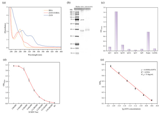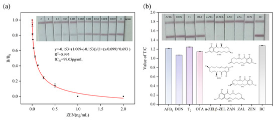 Zearalenone (ZEN), a stable mycotoxin with estrogenic activity produced by various Fusarium species, poses a serious food safety risk. To facilitate the rapid, sensitive, on-site detection of ZEN in maize and ensure consumer dietary safety, a colloidal gold immunochromatographic assay (CG-ICA) based on a monoclonal antibody was established. ZEN was converted via oxime derivatization into hapten ZAN-O, which was conjugated to a carrier protein to prepare an immunogen for producing a highly specific and sensitive monoclonal antibody. Then, the antibody was conjugated into colloidal gold nanoparticles (AuNPs) and used as capture bioprobes of the CG-ICA test strip. The highly sensitive and specific detection platform was established through systematic optimization of pH value, coating antigen concentration, antibody-labeling dosage, incubation time, and strip assembly conditions. Under optimized conditions, the strip exhibited a detection limit of 11.79 pg/mL and an IC50 of 99.06 pg/mL, with a linear detection range of 13.40–732.48 pg/mL. In addition, the anti-interference capability assay demonstrated that the developed test strip possessed excellent specificity. In spiked maize samples, the CG-ICA test strip demonstrated recoveries ranging from 85.36% to 98.86%, with relative standard deviations (RSDs) below 10%. Thus, the CG-ICA strip provides a rapid, sensitive, and robust on-site tool for ZEN screening in maize, and can be adapted to other hazards by simply switching the antibody.
