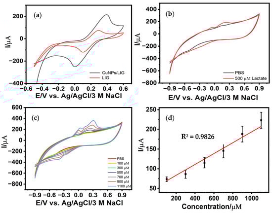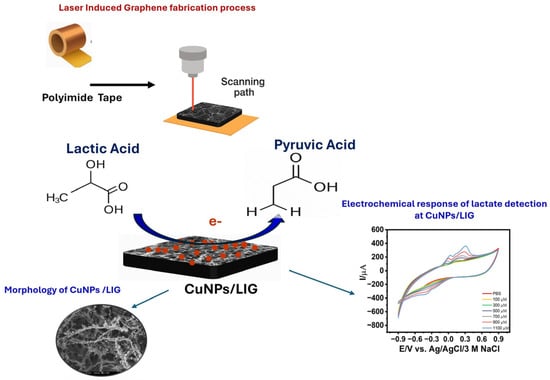 A scalable and facile fabrication strategy is presented for developing a flexible, nanostructured, non-enzymatic electrochemical sensor for lactate detection based on copper-modified laser-induced graphene (CuNPs/LIG). A one-step electrodeposition process was employed to uniformly decorate the porous LIG framework with copper nanostructures, offering a