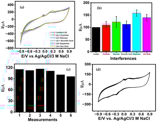 A scalable and facile fabrication strategy is presented for developing a flexible, nanostructured, non-enzymatic electrochemical sensor for lactate detection based on copper-modified laser-induced graphene (CuNPs/LIG). A one-step electrodeposition process was employed to uniformly decorate the porous LIG framework with copper nanostructures, offering a cost-effective and reproducible approach for constructing enzyme-free sensing platforms. Scanning electron microscopy and energy-dispersive X-ray spectroscopy confirmed dense Cu nanostructure loading and efficient interfacial integration across the conductive LIG surface. The resulting CuNPs/LIG electrode exhibited excellent electrocatalytic performance, achieving a sensitivity of 8.56 μA µM−1 cm−2 with a low detection limit of 42.65 μM and a linear response toward lactate concentrations ranging from 100 to 1100 μM in artificial saliva under physiological conditions. The sensor maintained high selectivity in the presence of physiologically relevant interferents. Practical applicability was demonstrated through recovery studies, where recovery rates exceeding 104% showcase the sensor’s analytical reliability in complex biological matrices. Overall, this work establishes a robust, sensitive, and cost-efficient Cu-nanostructured LIG sensing platform, offering strong potential for non-invasive lactate monitoring in real-world biomedical and wearable applications.