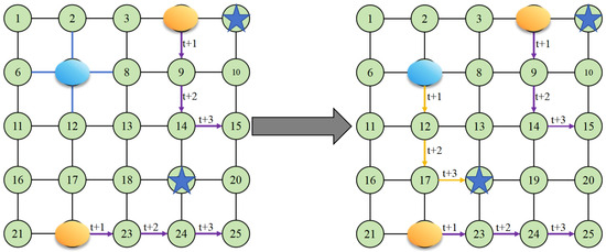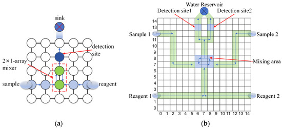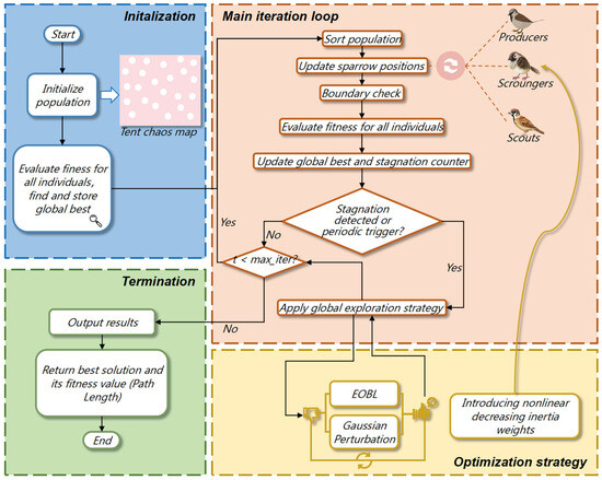 Digital microfluidic biochips (DMFBs) find extensive applications in biochemical experiments, medical diagnostics, and safety-critical domains, with their reliability dependent on efficient online testing technologies. However, traditional random search algorithms suffer from slow convergence and susceptibility to local optima under complex fluidic constraints. This paper proposes a hybrid optimization method based on priority strategy and an improved sparrow search algorithm for DMFB online test path planning. At the algorithmic level, the improved sparrow search algorithm incorporates three main components: tent chaotic mapping for population initialization, cosine adaptive weights together with Elite Opposition-based Learning (EOBL) to balance global exploration and local exploitation, and a Gaussian perturbation mechanism for fine-grained refinement of promising solutions. Concurrently, this paper proposes an intelligent rescue strategy that integrates global graph-theoretic pathfinding, local greedy heuristics, and space–time constraint verification to establish a closed-loop decision-making system. The experimental results show that the proposed algorithm is efficient. On the standard 7 × 7–15 × 15 DMFB benchmark chips, the shortest offline test path length obtained by the algorithm is equal to the length of the Euler path, indicating that, for these regular layouts, the shortest test path has reached the known optimal value. In both offline and online testing, the shortest paths found by the proposed method are better than or equal to those of existing mainstream algorithms. In particular, for the 15 × 15 chip under online testing, the proposed method reduces the path length from 543 and 471 to 446 compared with the IPSO and IACA algorithms, respectively, and reduces the standard deviation by 53.14% and 39.4% compared with IGWO in offline and online testing.