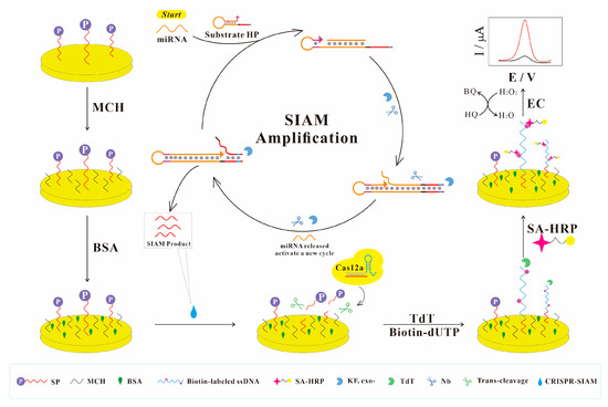 MicroRNAs, pivotal regulators of gene expression and physiology, serve as reliable biomarkers for early cancer diagnosis and therapy. As one of the earliest discovered miRNAs in the human genome, miRNA-21 provides critical information for early cancer diagnosis, drug therapy, and prognosis. In this work, we harness CRISPR as a bridge to integrate target-induced self-priming hairpin isothermal amplification (SIAM) with terminal transferase (TdT) polymerization labeling, constructing a facile, straightforward electrochemical biosensor for sensitive miRNA-21 detection. Unlike conventional single-strand template-based exponential amplification (EXPAR), the SIAM hairpin undergoes target triggered intramolecular conformational change, initiating extension and strand displacement reactions that suppress nonspecific dimer formation and lower background current. Notably, the assay requires only a single probe, enabling unidirectional signal amplification while nonspecific reactions caused by system complexity. The generated SIAM products activate the Cas12a/crRNA complex to trans-cleave PO43− modified single-stranded DNAs (ssDNAs); the resulting 3′ hydroxyl ssDNAs are subsequently labeled by TdT, with the assistance of SA-HRP catalyzing hydrogen peroxide, achieving robust signal amplification. Under optimized conditions, the cathodic current exhibits a logarithmic relationship with miRNA concentrations from 20 fM to 5.0 × 108 fM, with a detection limit of 9.2 fM. The biosensor successfully quantified miRNA-21 in commercial serum samples and biological lysates, demonstrating its potential for cancer diagnostics and therapy.