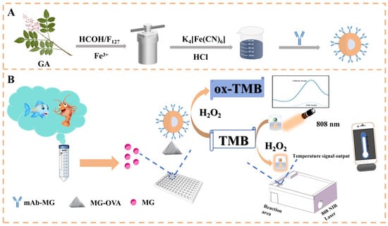 In this study, a colorimetric–photothermal dual-mode immunosensor based on Fe(Ⅲ)–gallic acid composite Prussian blue nanozyme (FGAN@PB NPs) was developed for the highly sensitive detection of malachite green (MG) in aquatic products. This strategy addresses the stability limitations associated with conventional horseradish peroxidase (HRP).