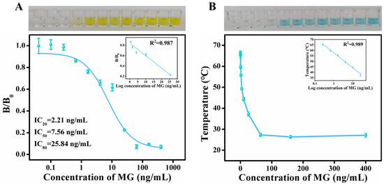 In this study, a colorimetric–photothermal dual-mode immunosensor based on Fe(Ⅲ)–gallic acid composite Prussian blue nanozyme (FGAN@PB NPs) was developed for the highly sensitive detection of malachite green (MG) in aquatic products. This strategy addresses the stability limitations associated with conventional horseradish peroxidase (HRP). In the colorimetric mode, the immunosensor exhibited an IC50 of 7.56 ng/mL with a linear detection range of 2.21–25.84 ng/mL. In the photothermal mode, the linear range was 0.262–25.6 ng/mL, with a detection limit (LOD) of 0.31 ng/mL. The results from the two detection modes were mutually corroborative. Moreover, the detection of the proposed immunosensor was strongly correlated with the LC-MS/MS, offering a promising approach for the rapid on-site screening of MG and improving its applicability in complex sample matrices.
