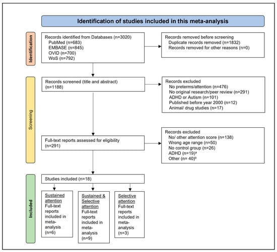 Objective: Preterm birth has been associated with an elevated risk of a broad range of neurodevelopmental impairments, including attentional deficits. This systematic review and meta-analysis aimed to synthesize the existing evidence on sustained and selective attention in school-aged children born preterm. Methods: Following
