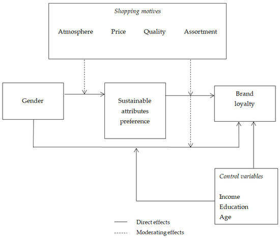 In recent years, consumer preference for sustainable food product attributes has increased. This research aims to investigate the moderating influence of consumers’ shopping motives on the interplay among gender, preferences for sustainable attributes, and brand loyalty. An online cross-sectional study was undertaken with 506 food consumers. Structural equation modeling was used to estimate direct, indirect, and moderating effects between the studied constructs and variables. We found that high quality positively moderates the relationships between gender and sustainable attributes and between gender and brand loyalty, while price as a shopping motive (marginally) negatively moderates these relationships. These findings suggest that brand managers aiming to strengthen brand loyalty among sustainability-oriented consumers—particularly where gender-based differences emerge—may benefit most from pairing sustainability positioning with strong-quality retail settings. In contrast, price-focused retail settings are less effective for activating sustainability-based brand loyalty.