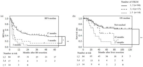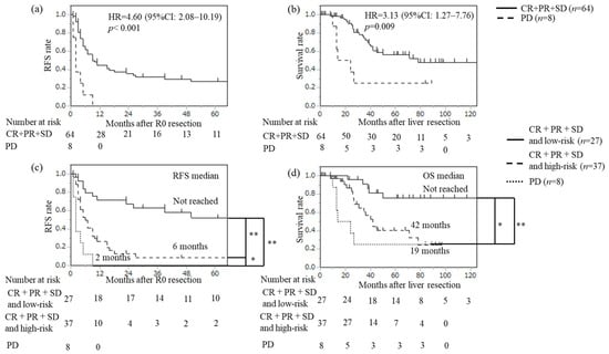 Background: Preoperative chemotherapy is increasingly used for colorectal liver metastases (CRLM), but simple risk stratification tools for routine practice remain limited. We developed a simple risk model to predict outcomes after curative-intent CRLM resection, including in patients receiving preoperative chemotherapy. Methods: We retrospectively analyzed 115 patients who underwent initial curative-intent liver resection for CRLM at two centers. Factors associated with recurrence-free survival (RFS) and overall survival (OS) were evaluated using Cox proportional hazards models and log-rank tests. Model performance was benchmarked against the Beppu nomogram and Fong’s clinical risk score using the area under the curve (AUC). Outcomes were also assessed based on response to preoperative chemotherapy. Results: Having ≥3 CRLMs was the only independent predictor common to both OS and RFS. Among patients with 1–2 CRLMs, the largest tumor diameter being ≥5 cm independently predicted RFS. A composite high-risk definition (≥3 CRLMs, or 1–2 CRLMs with a diameter ≥ 5 cm) independently predicted recurrence (HR 2.05, p = 0.007) and overall mortality (HR 2.24, p = 0.017). The AUCs were similar to the Beppu nomogram for recurrence (0.68 vs. 0.70 (p = 0.683) at 36 months, 0.66 vs. 0.68 (p = 0.766) at 60 months) and to Fong’s score for survival (0.59 vs. 0.64 (p = 0.430) at 36 months, 0.65 vs. 0.74 (p = 0.074) at 60 months). Among patients receiving preoperative chemotherapy (n = 72), high-risk status was associated with poorer RFS (HR 3.11, p < 0.001) and OS (HR 2.80, p = 0.010). Within this subgroup, progressive disease (PD) was associated with worse outcomes than disease control (CR/PR/SD). Conclusions: This two-variable, rule-based model provides an easy-to-use tool for postoperative risk stratification after CRLM resection, and incorporating chemotherapy response may further refine prognostication.