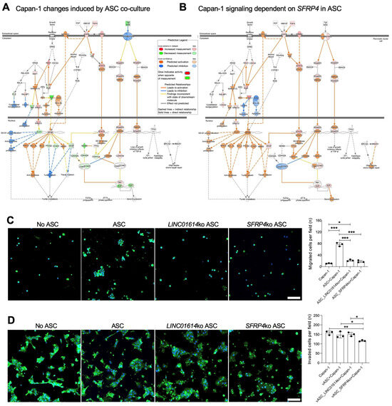 Background/objectives: Progression of pancreatic ductal adenocarcinoma (PDAC) and other carcinomas relies on cancer-associated fibroblasts (CAFs). A subset of CAFs is derived from adipose stromal cells (ASCs) recruited by tumors and the ASC-CAF conversion has been associated with invasiveness and poor prognosis. Methods: To explore the underlying molecular mechanisms, we used a model based on primary ASCs derived from human visceral adipose tissue co-cultured with human PDAC cell line Capan-1. To investigate cancer progression in vivo, we also used mice orthotopically grafted with mouse KPC cells. Results: Genomic analysis revealed that Capan-1 co-culture induces Wnt and TGFβ signaling and extracellular matrix (ECM) gene expression in ASC. We investigated the function of two markers of the fibroblastic transition highly induced by cancer cells: a long non-coding RNA LINC01614 and a Wnt signaling modulator SFRP4. By using ASCs with either SFRP4 or LINC01614 knocked out (ko), we showed that both genes are required for Wnt/TGFβ signaling and ECM induction in ASCs by Capan-1. Analysis of changes in Capan-1 genes that rely on LINC01614 and SFRP4 expression in ASCs also identified the Wnt and TGF pathways. SFRP4 ko in ASCs suppressed both migration and invasion of Capan-1 cells. We show that tumors in SFRP4 ko mice have less desmoplasia, less epithelial dedifferentiation, reduced growth rate, and reduced progression to metastasis. Conclusions: We conclude that SFRP4 promotes cancer progression in pancreatic cancer and is a promising therapeutic target.